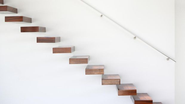 Jika Anda menginginkan rumah dengan nuansa minimalis dan modern, railing tangga melayang adalah pilihan yang sempurna. Desain ini menciptakan ilusi railing melayang di udara sehingga memberi kesan futuristik pada rumah. Bagian bawah dari railing dibiarkan kosong, sehingga hanya ada besi untuk pegangan. Model ini tidak cocok bagi Anda yang memiliki anak kecil karena kurang aman. Jika Anda tetap ingin menggunakan model ini, Anda dapat memberi kaca pada bagian bawah pegangan. Sehingga hal ini dapat meminimalisir risiko orang yang jatuh, tanpa mengurangi estetika.